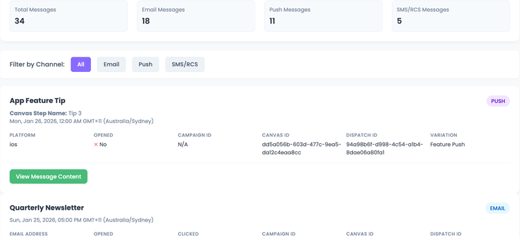 View the actual rendered content of every Email, SMS, RCS and Push message sent to a customer.