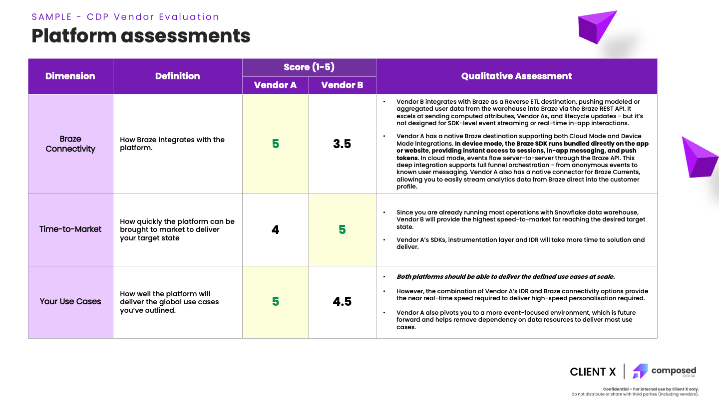- CDP Vendor Evaluation Report: Containing platform assessment (quantitative and qualitative), decision guide, and our overall recommendation with reasoning.